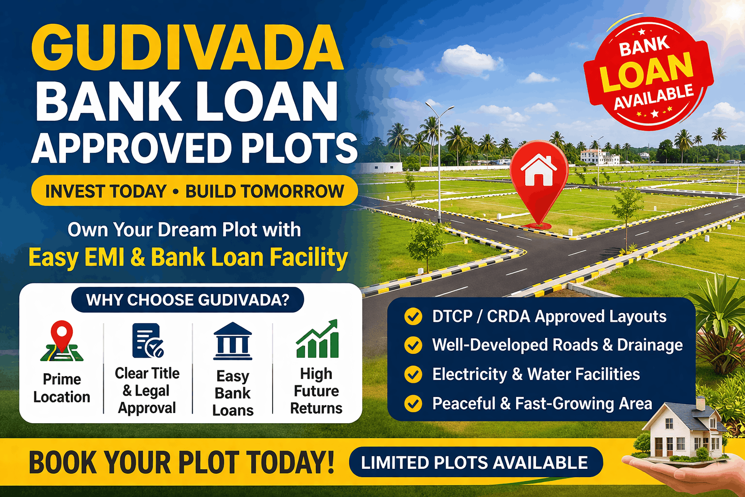 If you are looking for a safe and affordable real estate investment, Gudivada bank loan approved plots are one of the best options in today’s market. Located near the fast-developing regions of Gudivada, these plots offer excellent connectivity, clear documentation, and easy financing options through leading banks.