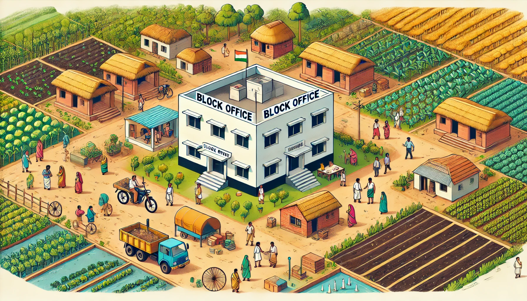 A block (or community development block) is a rural administrative unit that is part of a district. It typically consists of a group of villages and panchayats (local governing bodies). Each block acts as a decentralized hub for implementing development programs, managing government schemes, and facilitating coordination between village-level administrations.