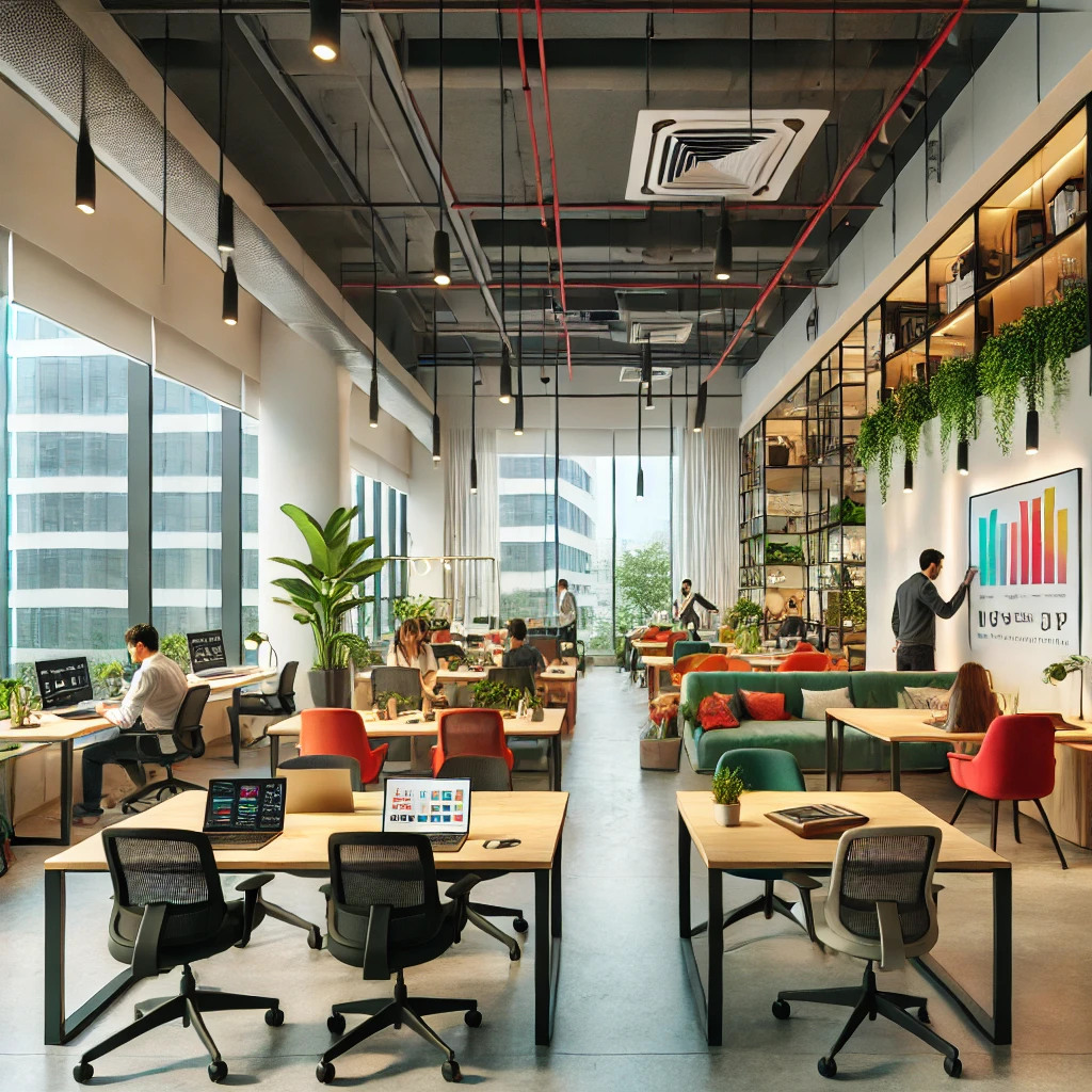 The workspace features ergonomic furniture, high-speed internet, conference rooms, and vibrant interiors tailored to enhance focus and collaboration. -