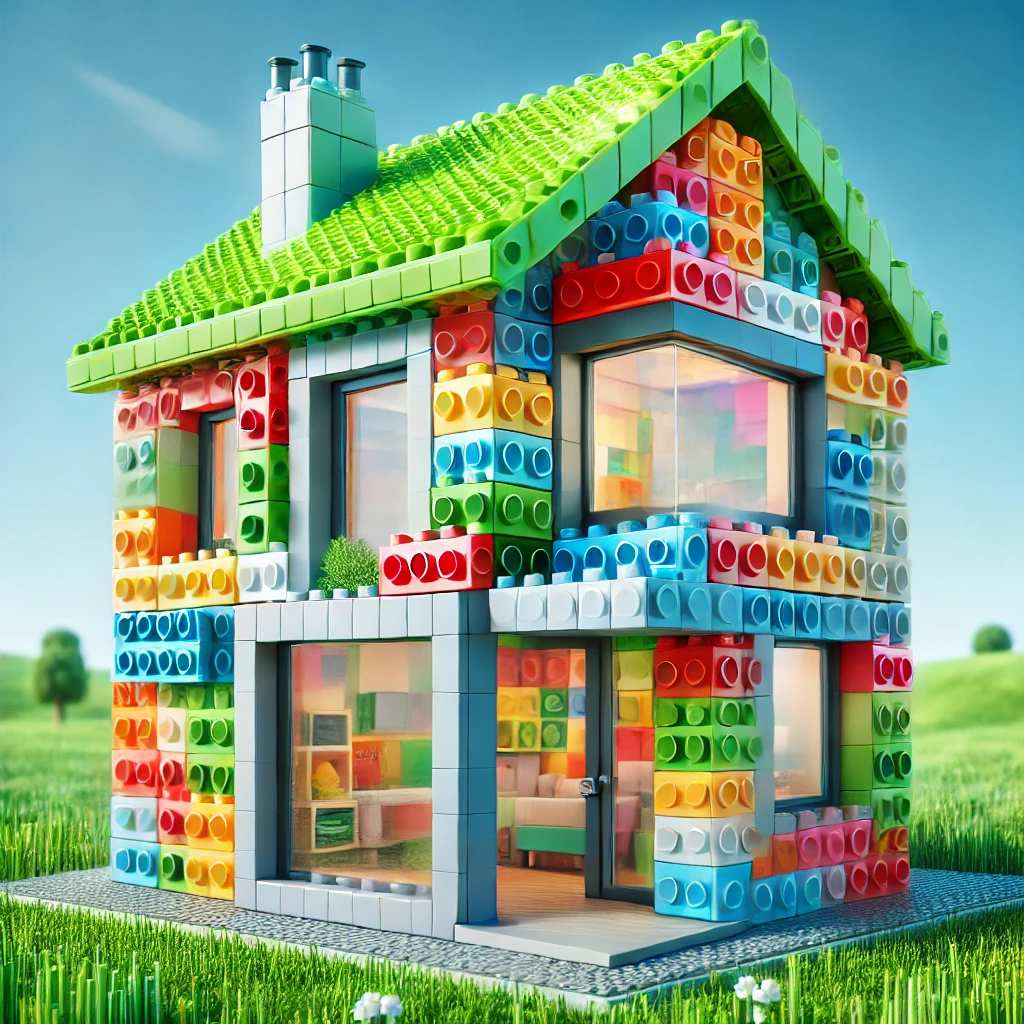 Building blocks house with modular design, showcasing creativity, eco-friendliness, and modern architecture