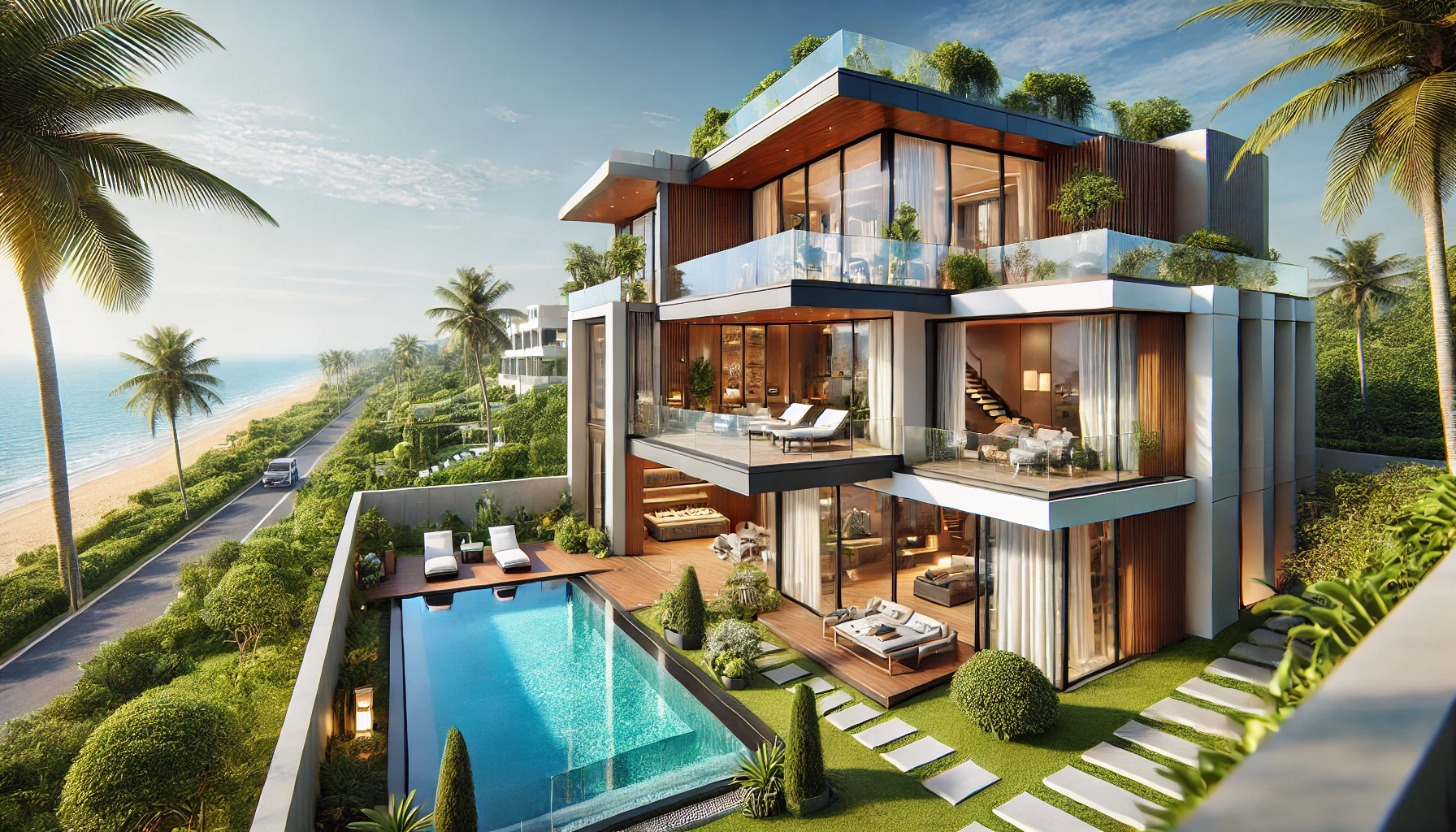 Luxurious villa with ocean view in Vizag, modern villa exterior in Vizag, beachfront property in Rushikonda.