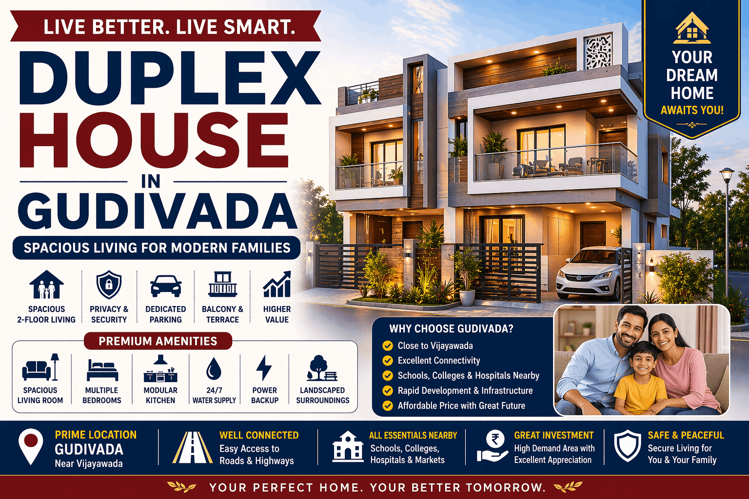If you are looking for a stylish and spacious home, a duplex house in Gudivada is an excellent choice. Duplex homes offer two levels of living space, combining privacy, comfort, and modern design—perfect for growing families.