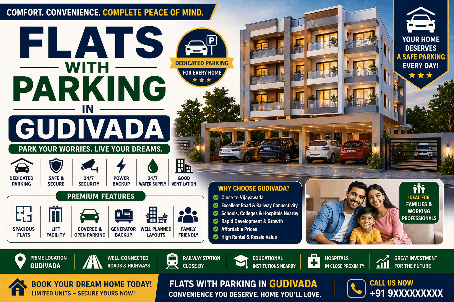 Investing in flats with parking in Gudivada ensures convenience, safety, and better resale value. With growing infrastructure and proximity to Vijayawada, Gudivada is a smart choice for modern homebuyers.