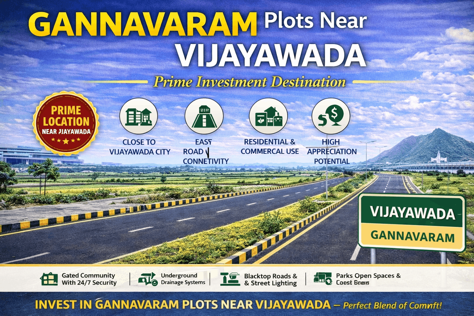 Gannavaram is strategically located along NH-16 and is home to Vijayawada International Airport, making it one of the most accessible and fast-developing areas in the region. Its close proximity to Vijayawada ensures easy access to all major facilities like schools, hospitals, shopping centers, and business hubs.