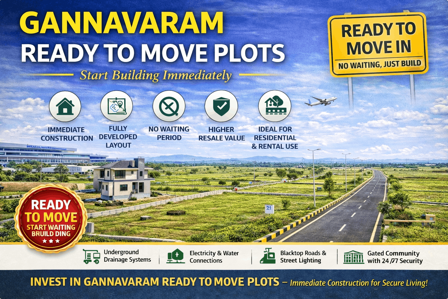With continuous development in Vijayawada and Amaravati regions, Gannavaram is witnessing steady property value growth. Ready-to-move plots, being fully developed, attract higher demand and faster appreciation.