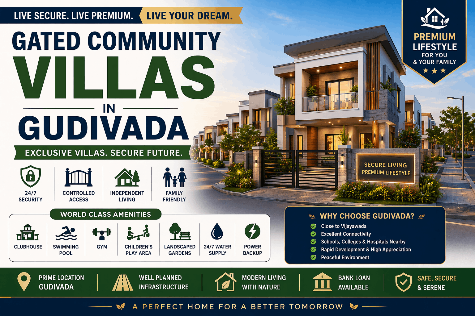 Investing in gated community villas in Gudivada offers a perfect mix of luxury, security, and long-term value. With rapid growth and proximity to Vijayawada, Gudivada is becoming a preferred destination for premium housing.