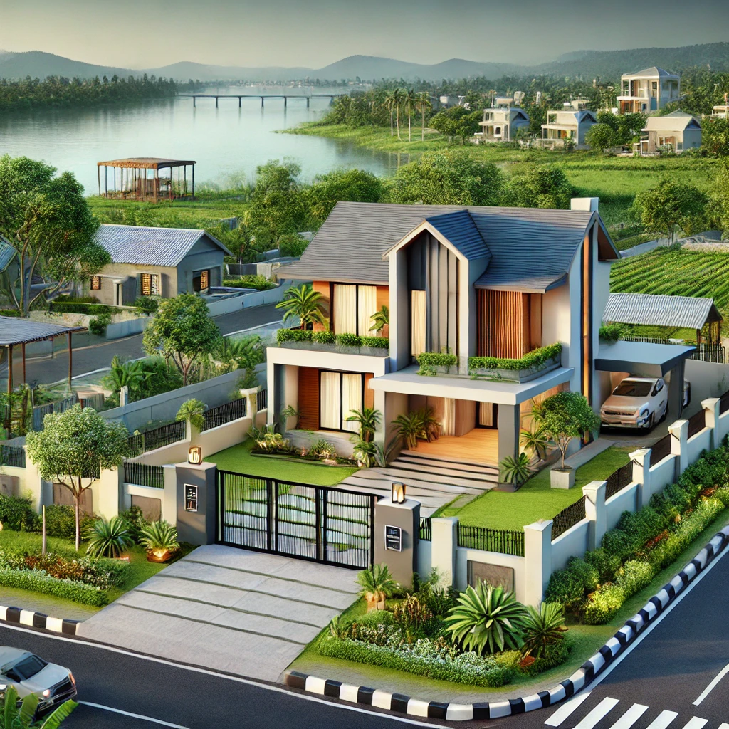 Modern houses and villas for sale in Rajahmundry with scenic backdrops of the Godavari River and lush greenery