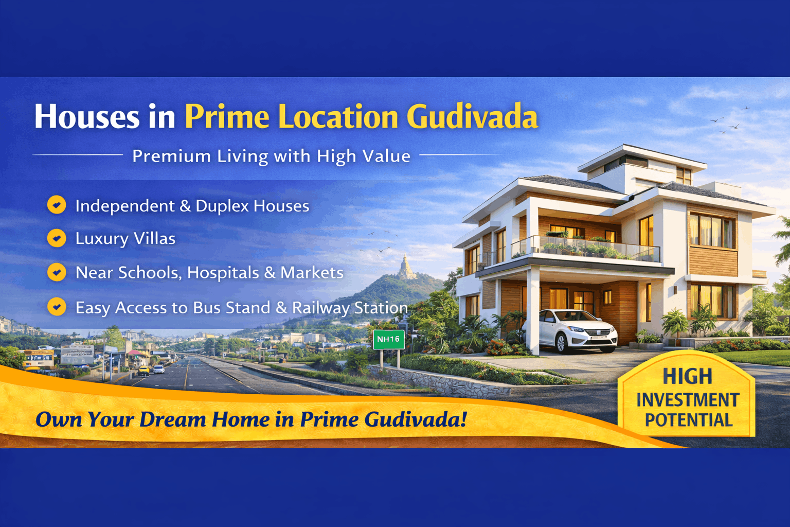 Looking for houses in prime locations in Gudivada? Prime areas in Gudivada are rapidly growing and highly preferred by homebuyers due to their excellent connectivity, developed surroundings, and strong investment potential. Owning a house in a prime location ensures both comfortable living and long-term value appreciation.