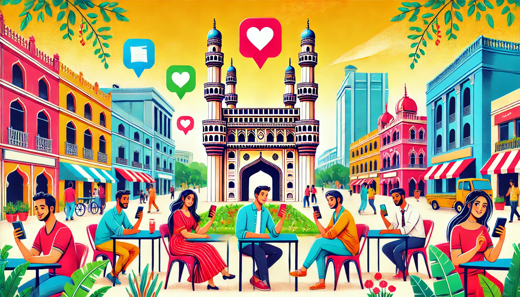 People in Hyderabad using dating apps on their phones with a backdrop of Charminar and modern city life