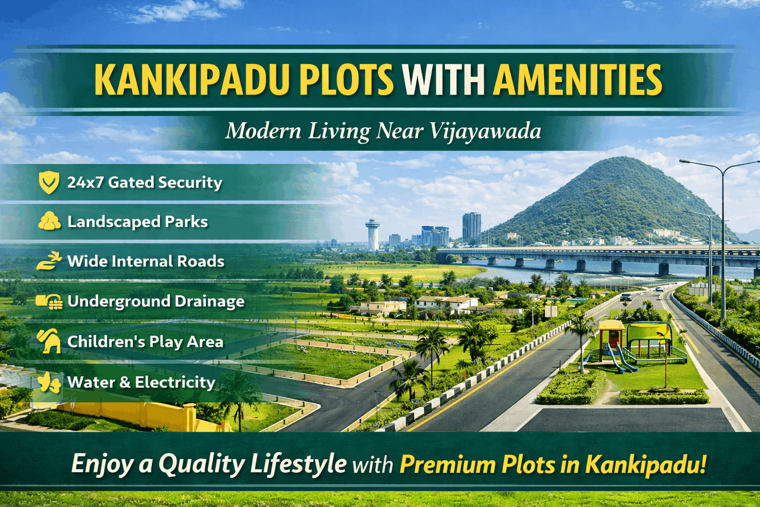 Today’s buyers are not just looking for land—they want a complete lifestyle. Plots in Kankipadu come with thoughtfully designed amenities that enhance both living standards and property value.