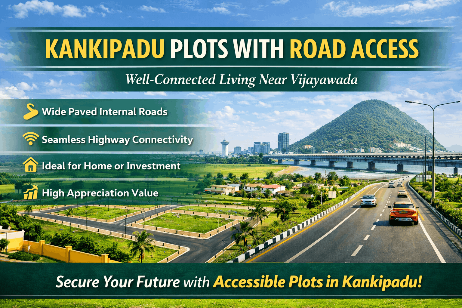 Kankipadu is rapidly developing into a preferred residential and investment destination near Vijayawada, especially for buyers looking for plots with excellent road access. With well-laid internal roads, proximity to highways, and smooth connectivity to key locations, Kankipadu offers the perfect combination of convenience and growth potential.