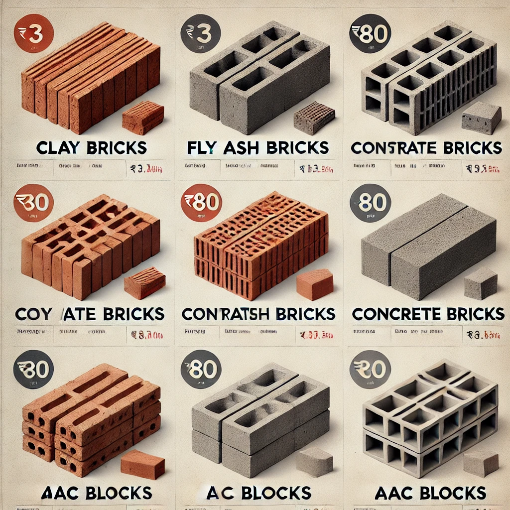 - AAC (Autoclaved Aerated Concrete) Blocks: ₹50 to ₹80 per block (larger than standard bricks).