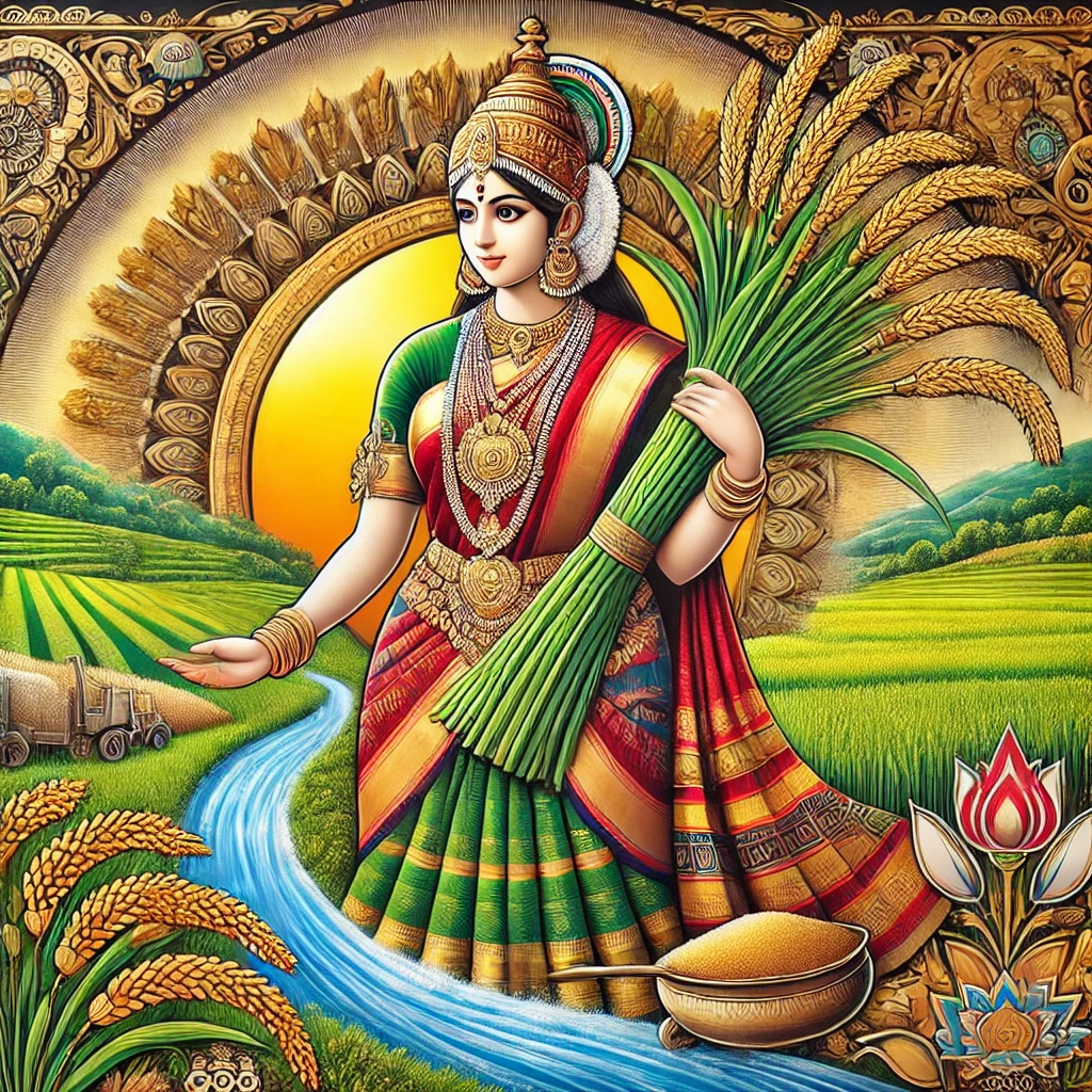 Traditional Telugu Talli illustration holding paddy sheaves, symbolizing Telugu culture and prosperity