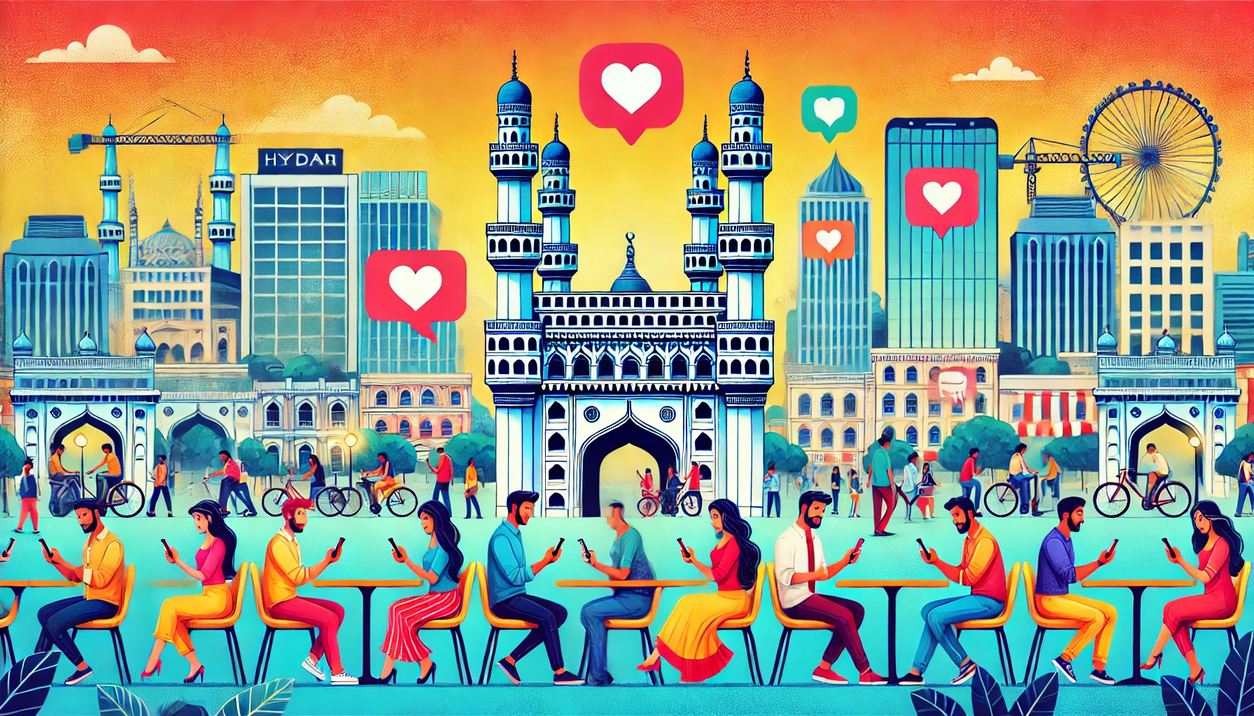 People using dating apps on their smartphones, set against a vibrant cityscape of Hyderabad