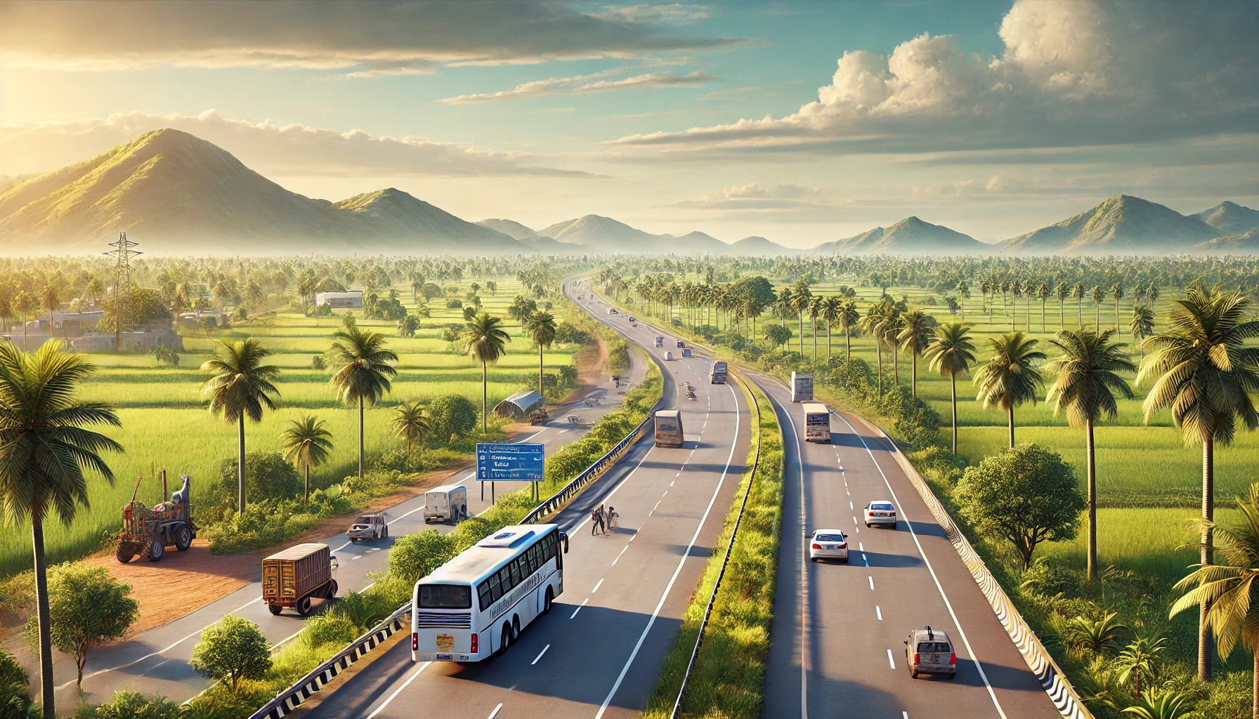 Highway connecting Vizianagaram and Vijayawada with scenic landscapes.