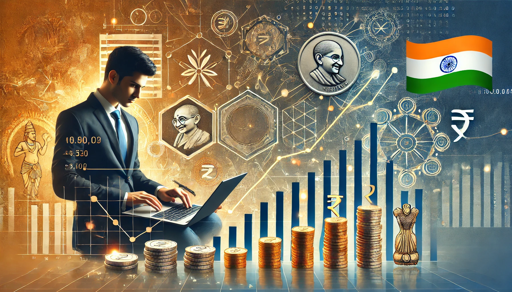 Financial planning concept with charts, coins, and a growing graph for Wealth Wisdom India